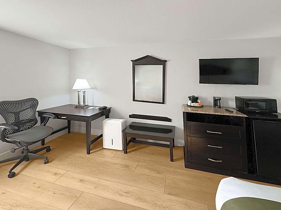 A flat-screen cable TV is provided in this room, along with a microwave and fridge.